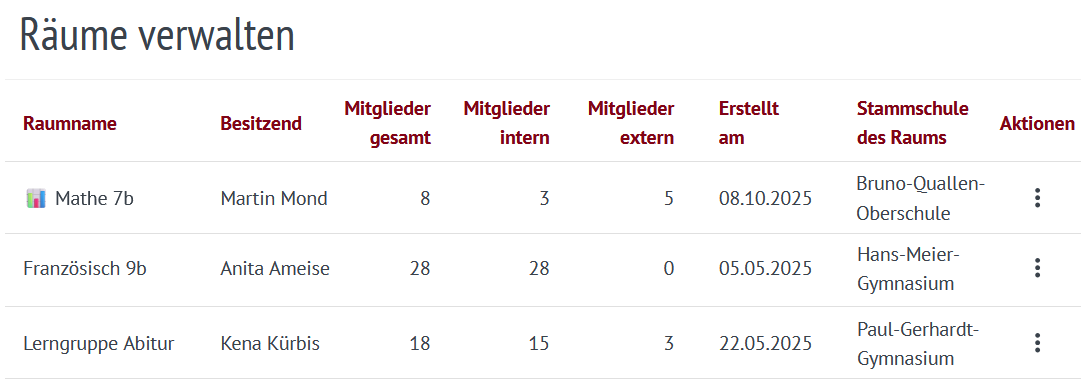 Hier können Sie alle Räume sehen, die an Ihrer Schule gegründet wurden oder Mitglieder Ihrer Schule beinhalten.